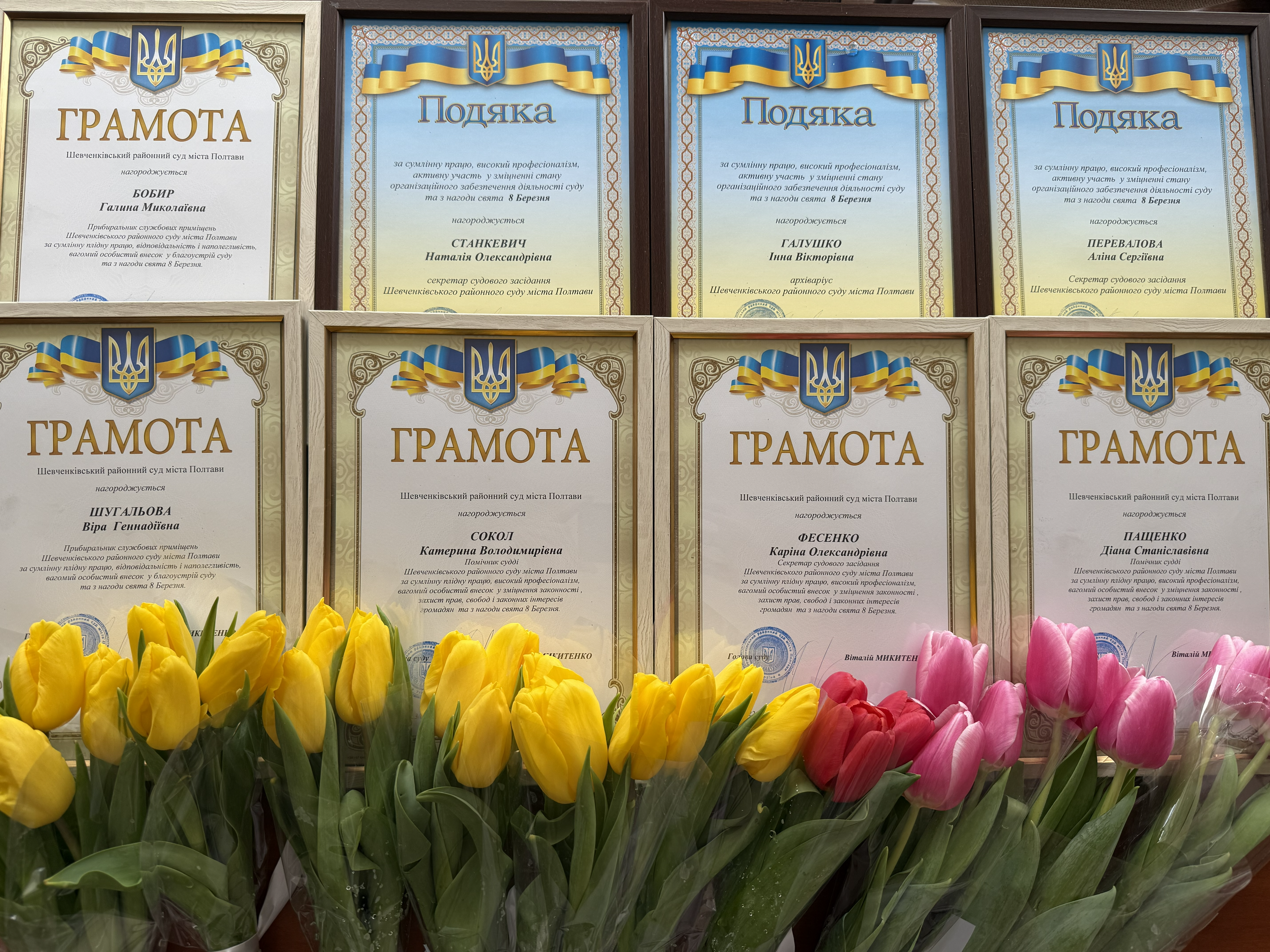 Грамотами голови суду відзначені: прибиральниці Галина БОБИР та Віра ШУГАЛЬОВА, секретар судового засідання Каріна ФЕСЕНКО, помічники суддів Катерина СОКОЛ та Діана ПАЩЕНКО.