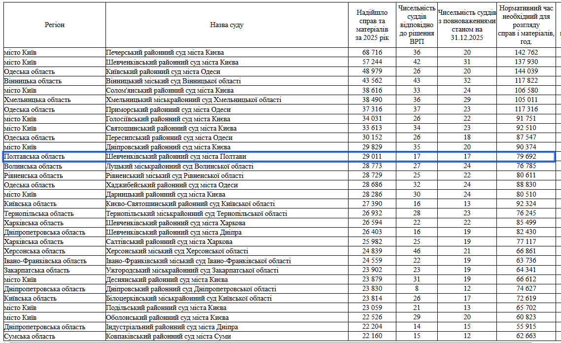 Оновилено інтерактивну карту судів України з розрахунками нормативів навантаження на суддів і суди з урахуванням кількості справ, які розглядаються судами впродовж звітного 2025 року.