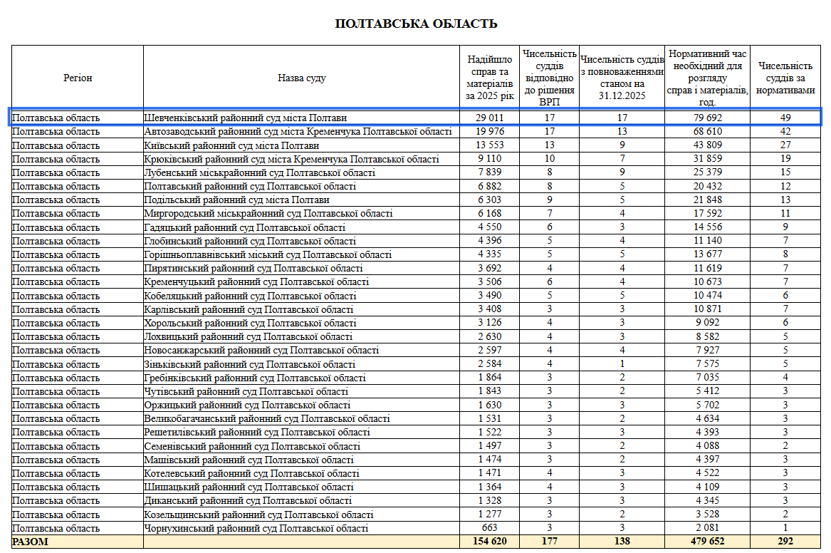 Згідно вказаних статистичних даних за 2025 рік Шевченківський районний суд міста Полтави займає дванадцяте місце по Україні та перше місце в Полтавській області за рівнем навантаження.